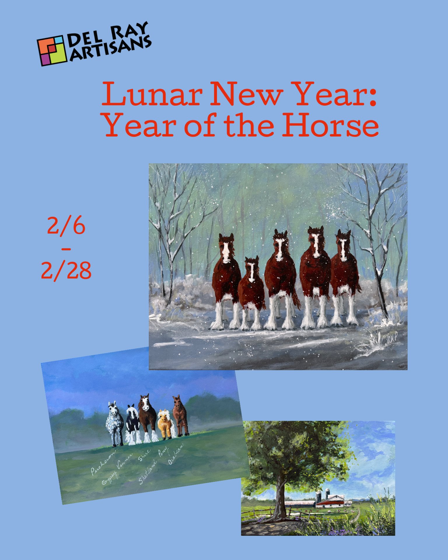 At DEL RAY ARTISANS my paintings “Clydesdales in the Snow” “Horses” and “Horse Farm” help celebrate the “Year of the Fire Horse”.