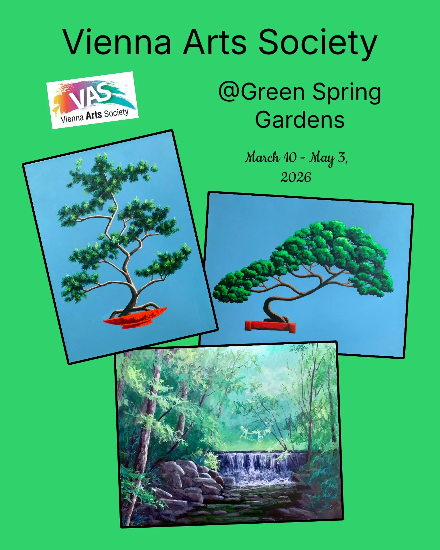 Three of my paintings “Bonsai” “Bonsai 2” and “Waterfall” are in the Vienna Arts Society Show.