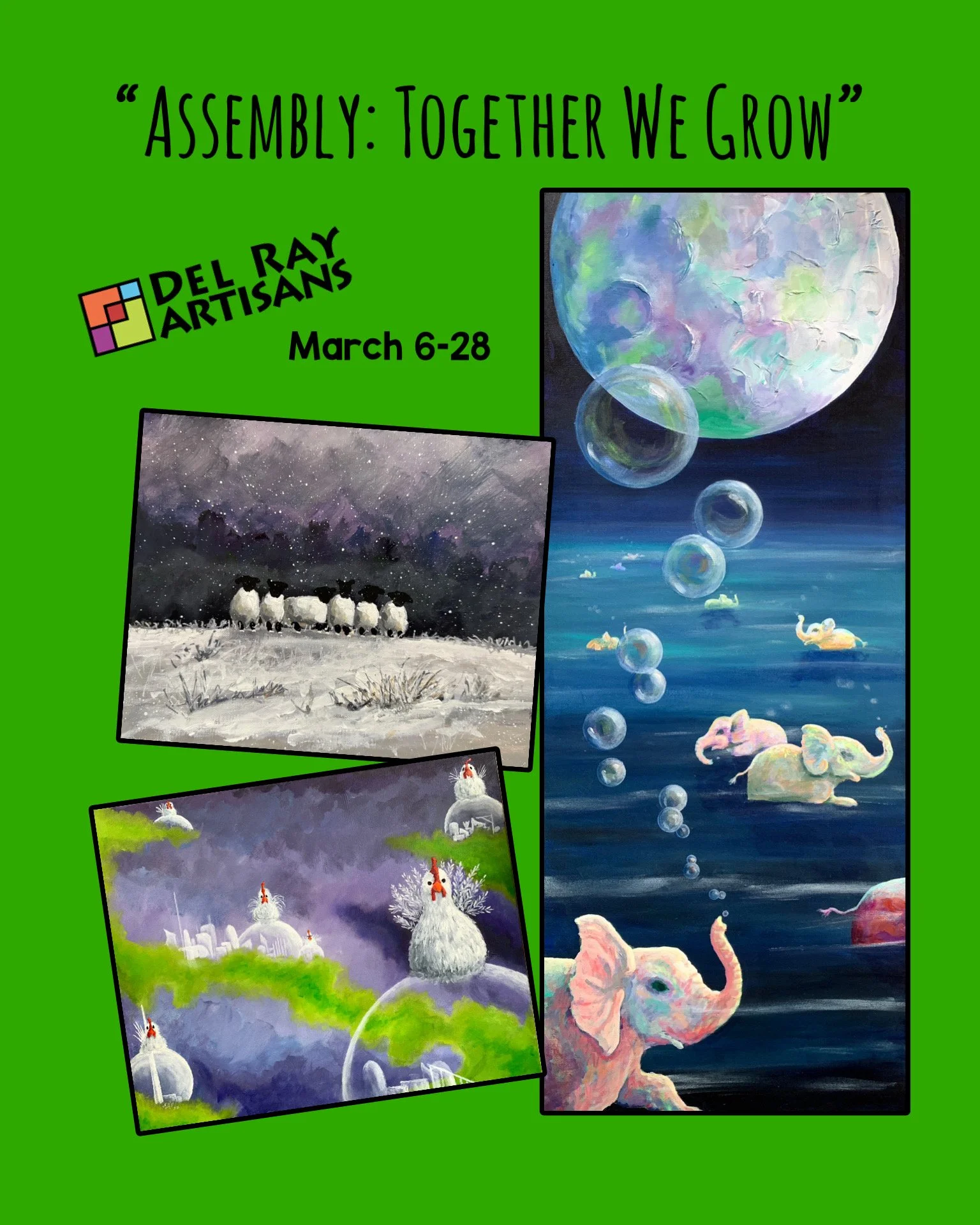 You are invited to come see the current show “Assembly” including my three paintings “Sheep in the Snow” “Space Chickens” and “Elephants Swimming”.