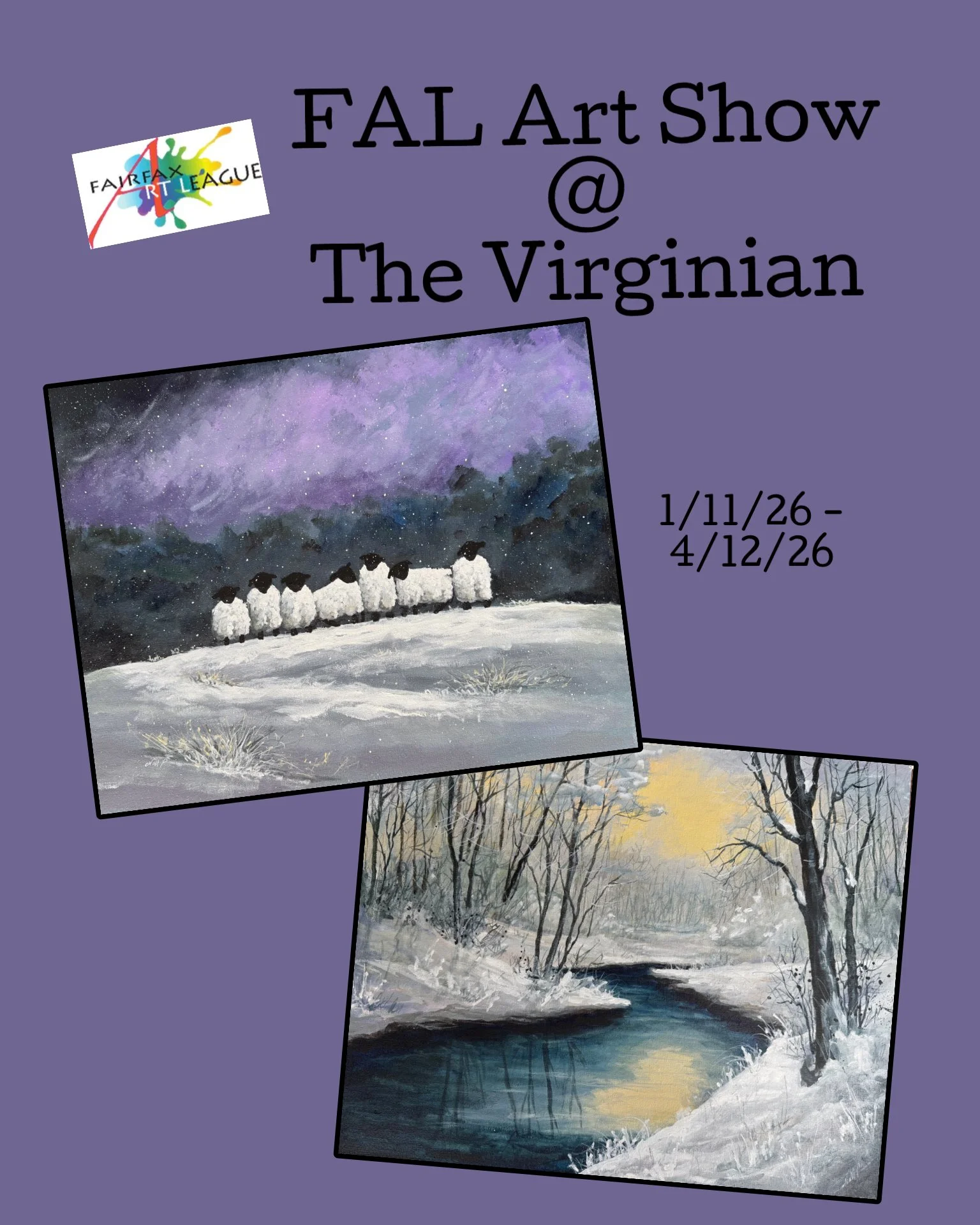 Included in the Fairfax Art League Show @ The Virginian are my two paintings “Sheep in the Snow” and “Accotink Creek Winter”.